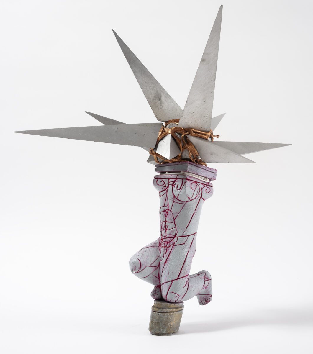 Skulptura „Čovek koji nosi zvezdu“ autora Mrđana Bajića, nastala je 2020. godine kombinacijom materijala: keramika, drvo, aluminijum, mesing i bakar. U kontekstu dela Mrdjana Bajića vidimo niz kompleksnih i međusobno povezanih procesa u tretiranju skulpture koji proističu iz postmodernističke sumnje u velike narative modernizma, ali prevazilaze zahvate fragmentacije i razgradnje ovog medija izmeštajući datu problematiku u polja prostorne, značenjske i empirijske (iskustvene) egzistencije skulpture. Promišljanje skulpture na navedenim nivoima izlazi iz okvira čisto medijumske zaokupljenosti figurom i formom, i uvodi arhitektonsko-konstruktorsku metodologiju u njena istraživanja. Zbog pokretanja postupaka negacije volumena i nestajanja rasparčane figure pod nadrealnom arhitekturom koja se iz prototipskih oblika građenjem razvija u prostorno samostalne kompozicione sklopove, Bajićeva skulptura se može okarakterisati kao skulptotektura, kao istovremeno autohtona i nestabilna konstrukcija utemeljena u napetosti između različitih principa (skulptura i arhitektura, redukcija i konstrukcija, imaginacija i racionalizacija).