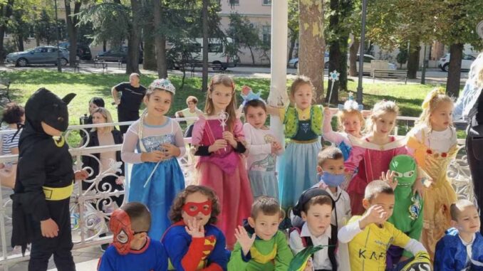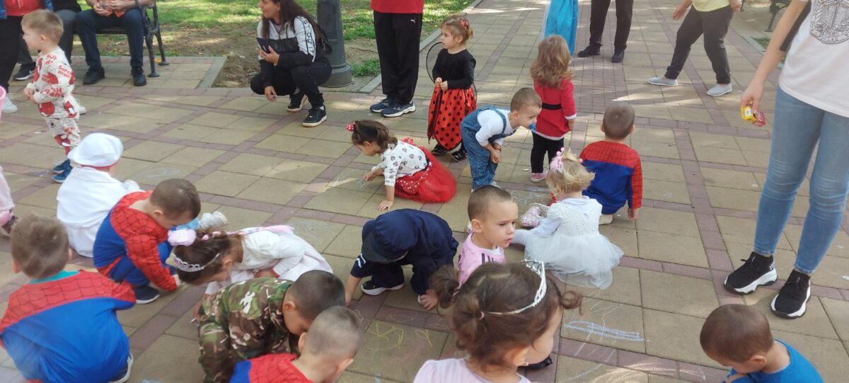 Deca iz Predškolske ustanove „Anđelka Đurić“ juče su imali maskenbal, a zajedno sa svojim vaspitačicama bili su i u Gradskom parku gde su pokazali svoju maštovitost crtajući na betonu.