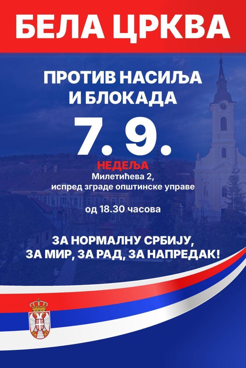 Skup pod sloganom „Protiv nasilja i blokada“ održaće se u nedelju 7. septembra ispred opštinske uprave, Miletićeva 2, sa početkom u 18. 30 časova.