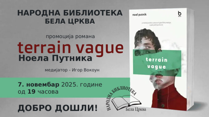 Roman Noela Putnika „Terrain vague“ biće predstavljen belocrkvanskoj čitalačkoj publici u petak, 7. novembra u čitaonici Narodne biblioteke u Beloj Crkvi, sa početkom u 19 časova.
