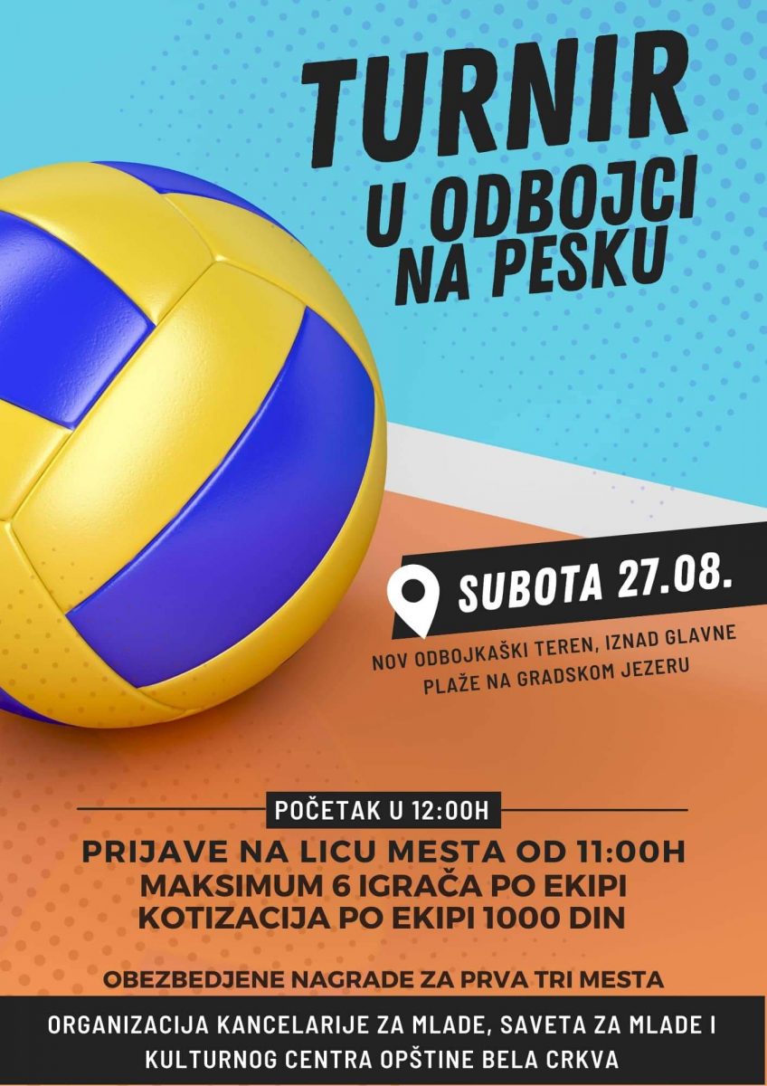 Turnir u odbojci na pesku održaće se u subotu, 27. avgusta, na novom odbojkaškom terenu iznad glavne plaže na Gradskom jezeru u Beloj Crkvi.