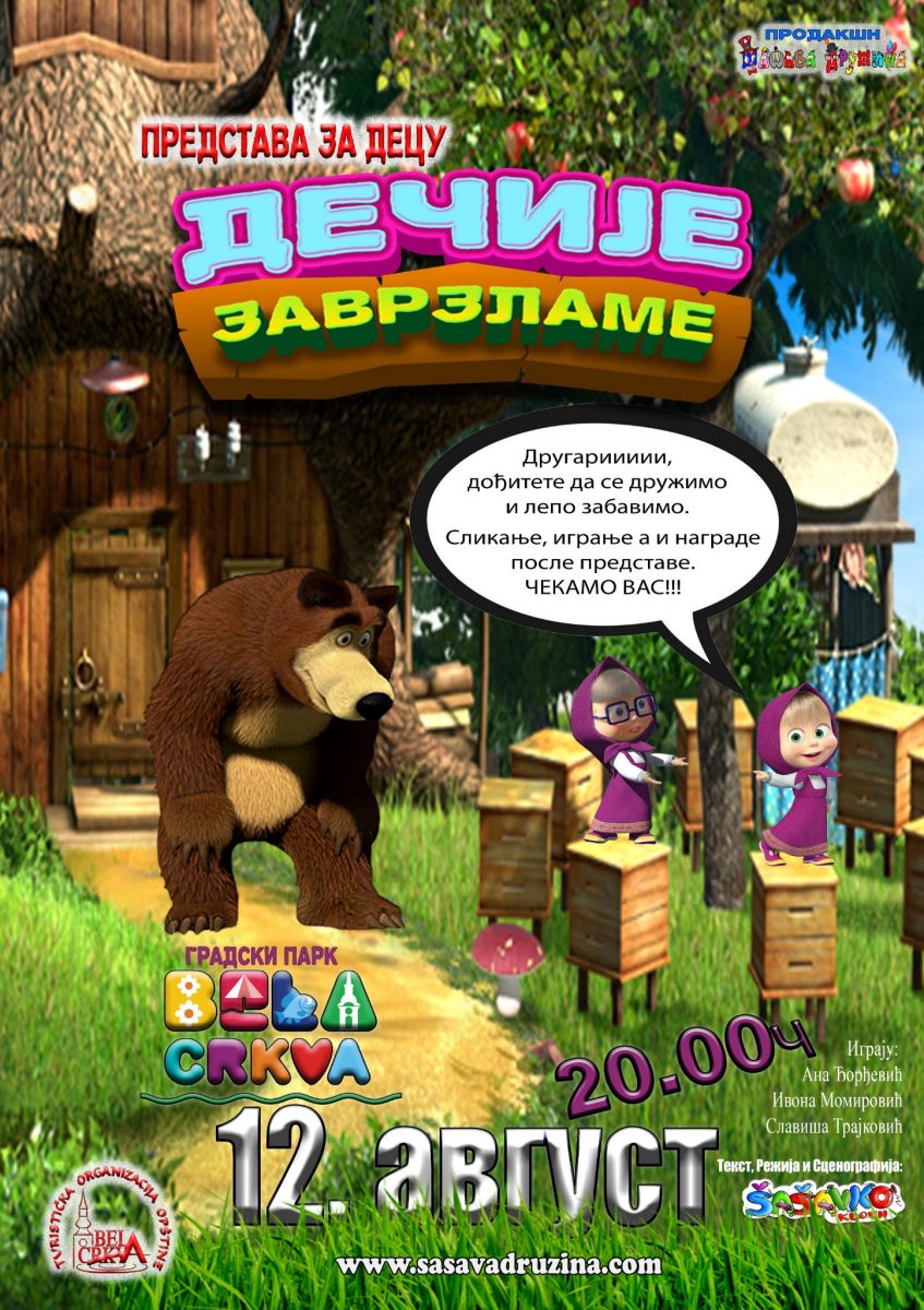 U predstavi “Dečije zavrzlame”- mjuziklu su glumci-animatori Ivona Momirović (Daša), Ana Đorđević (Maša), Slaviša Trajković (Meda Miško).